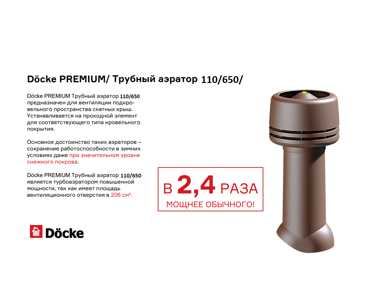 Трубный аэратор 110/650 является турбоаэратором повышенной мощности, так как имеет площадь вентиляционного отверстия в 206 см².